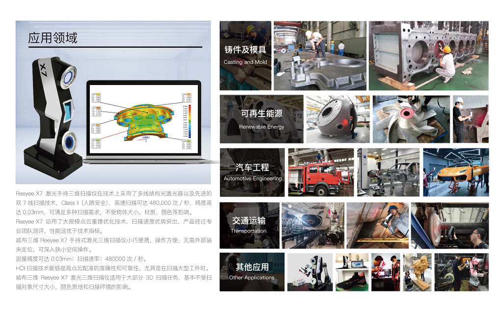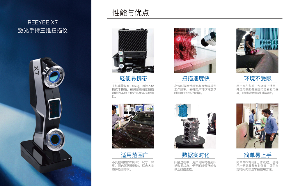 Reeyee X7全新升級,手持式激光三維掃描儀小巧便攜,操作 方便,無需外部裝夾定位,可深入狹小空間操作,掃描精度更高可達(dá)0.03mm,真正實(shí)現(xiàn)微米級掃描效率,掃描速率高達(dá)480000次/秒,HOI 掃描技術(shù),HOI掃描技術(shù)能夠提高點(diǎn)云配準(zhǔn)的準(zhǔn)確性和可靠性,尤其是在掃描大型工件時效果更加卓越!