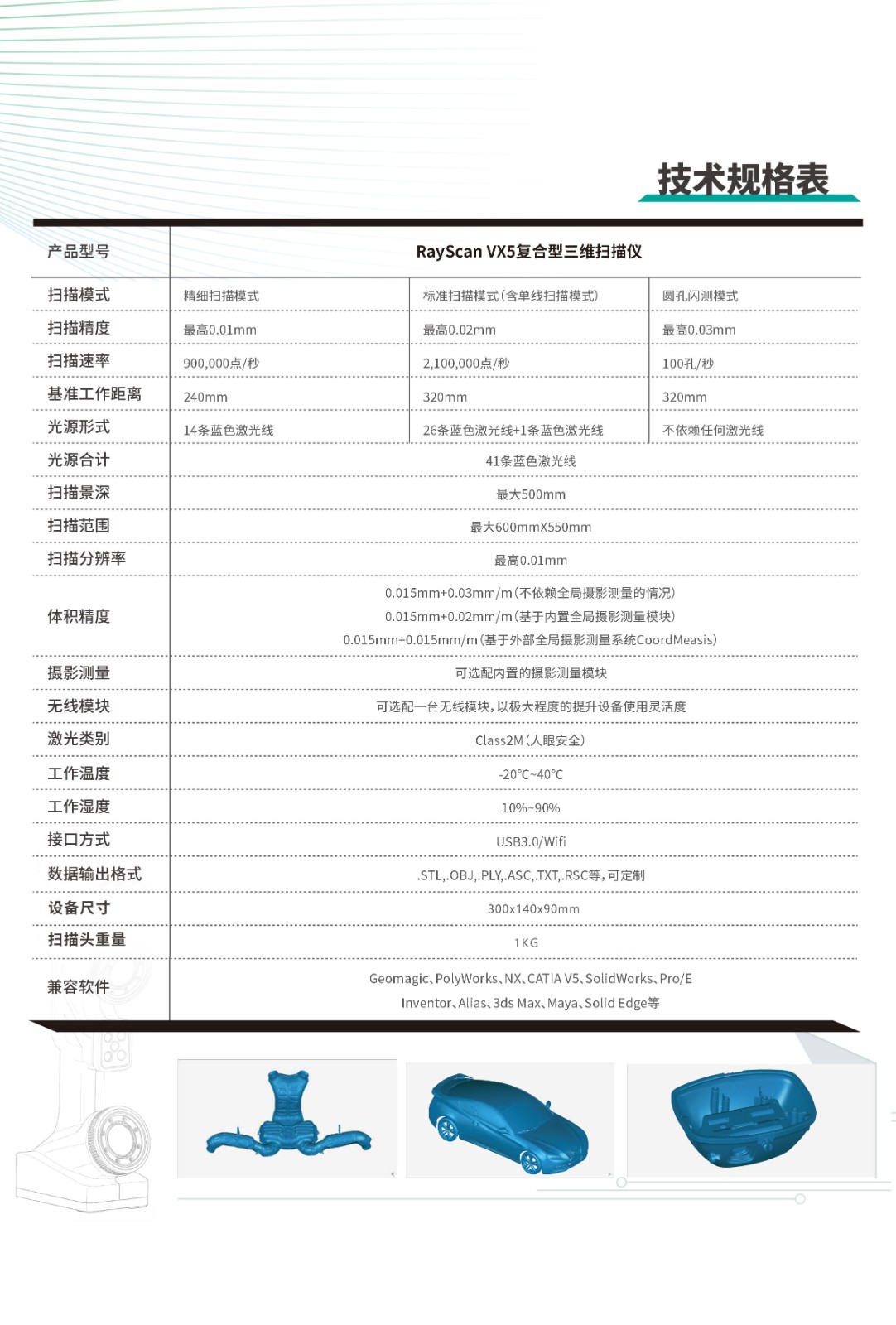 RavScanVX5復合型三維掃描儀是一種具有多種掃描模式的設備,可以按照精度、速率和工作距離等參數進行定制。它使用藍色激光線進行掃描,光源形式和光源合計也被列出。該設備可以以不同的模式進行掃描,包括標準掃描模式(含單線掃描模式)、圓孔閃測模式等。此外,還提到了設備的掃描景深、掃描范圍、掃描分辨率等參數。