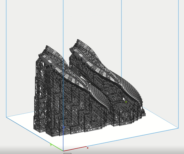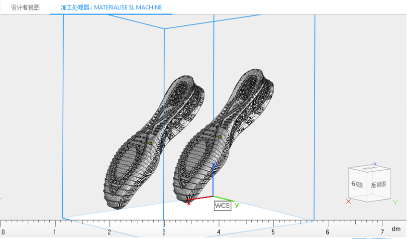 在圖中可以看到,導入Magics平臺中的紋理是二維的圖片。但是實際上黑白的偏移在數字化咬花模塊中已經以STL+的格式存儲, 加工處理器在切片時會自動處理STL+數據,基于切片還原帶有咬花的凹凸表面。既保證處理時數據量不會過大,同時實現了鞋子以及咬花的順利打印。