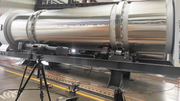 長(zhǎng)約10m,直徑2.5~3.5m左右的圓柱裝工件,主要測(cè)量?jī)啥送蛊饒A柱間的同軸度及斷面平行度,精度要求0.5mm。
