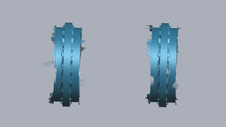 本案例工件主要測(cè)量?jī)啥耍瑹o需掃描完整數(shù)據(jù),但因工件較大且呈圓筒狀,因此除在兩端粘貼一圈定位標(biāo)點(diǎn)外,僅在中間部位粘貼少量標(biāo)記點(diǎn)進(jìn)行過渡。