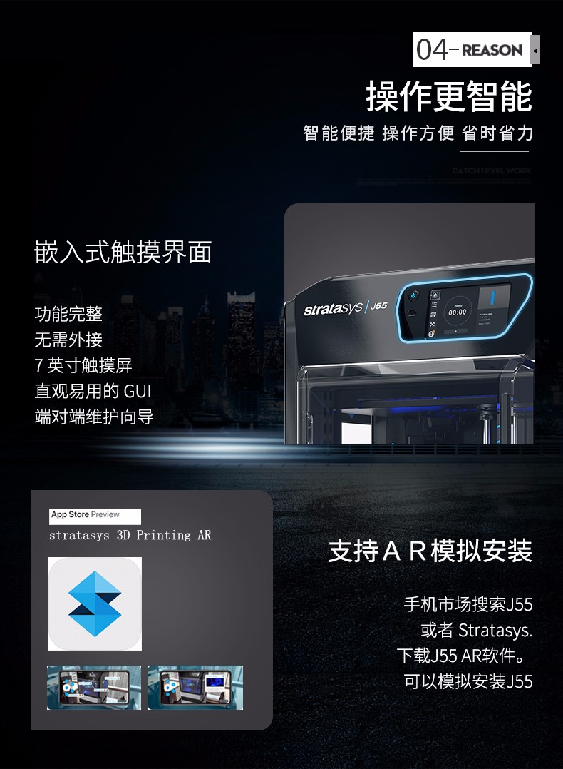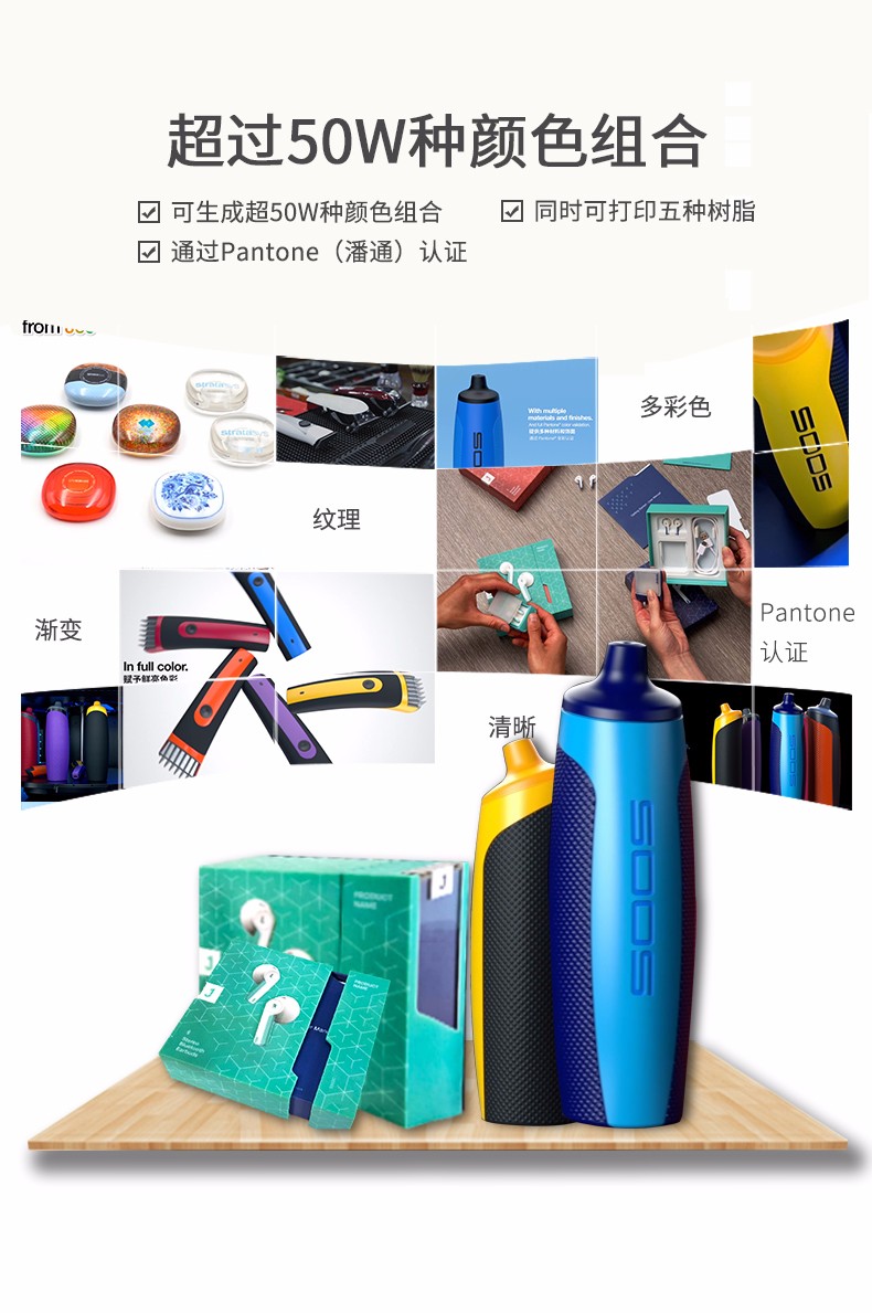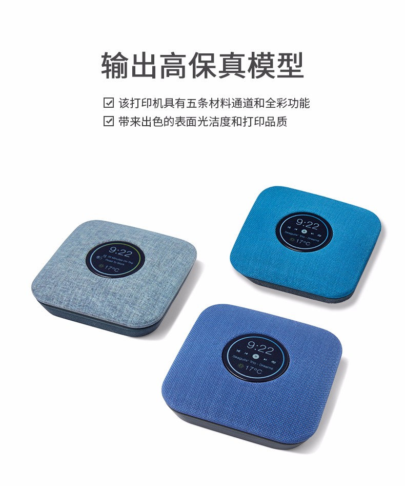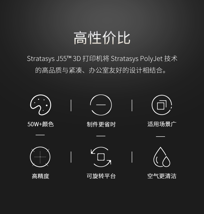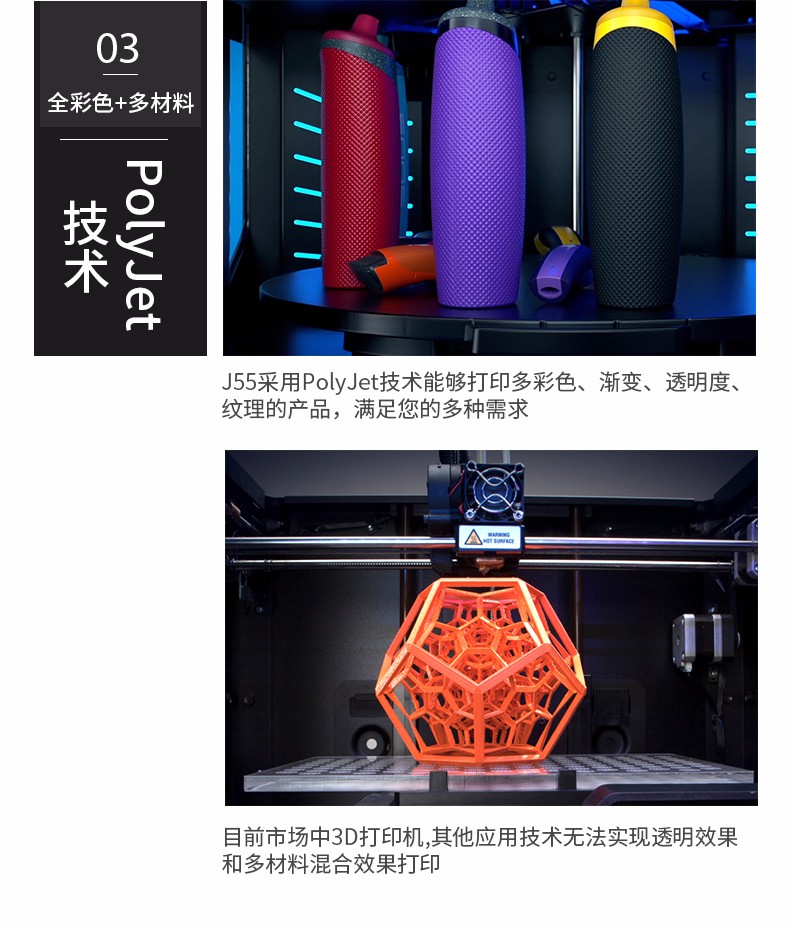 性能一:旋轉式打印平臺,J55采用旋轉式打印平臺,具有出色的表面光潔度和打印質量,擁有多材料功能以及可用于工業和機械設計的材料配置,可以保證非常穩定、一致的性能。性能二:超過500,000 種顏色組合J55可生成超過500,000 種可分辨的顏色組合,同時打印五種樹脂,并提供多材料性能。作為 PANTONE Validated? 認證的 3D 打印機,J55支持 Stratasys CMYK 顏色匹配超過1,900種可打印的 Pantone Solid Coated 和 SkinTones?,能顯著提高原型的打印速度、效率和色彩逼真度。無論您需要什么顏色和紋理,J55都能助您將最富想象力的想法變為現實,在設計過程中盡早作出更準確的決策。性能三:樣件幾乎無需后處理J55將 PolyJet 技術的高品質與緊湊、辦公室適用的設計結合起來,可以一次打印多色部件。由其打印出的零件幾乎不需要后處理,不僅將材料浪費降至最低限度,還大大節省了打磨和手工上漆的時間和工作量,使設計過程更加順暢,部件的品質更加穩定。