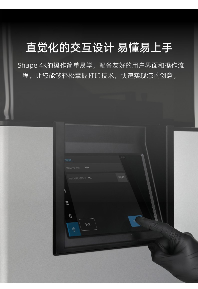 shape 4K配備了樹脂液位檢測功能,可以在缺料時暫停打印并提醒用戶,加料后繼續打印,從而保證打印過程的連續性和穩定性。