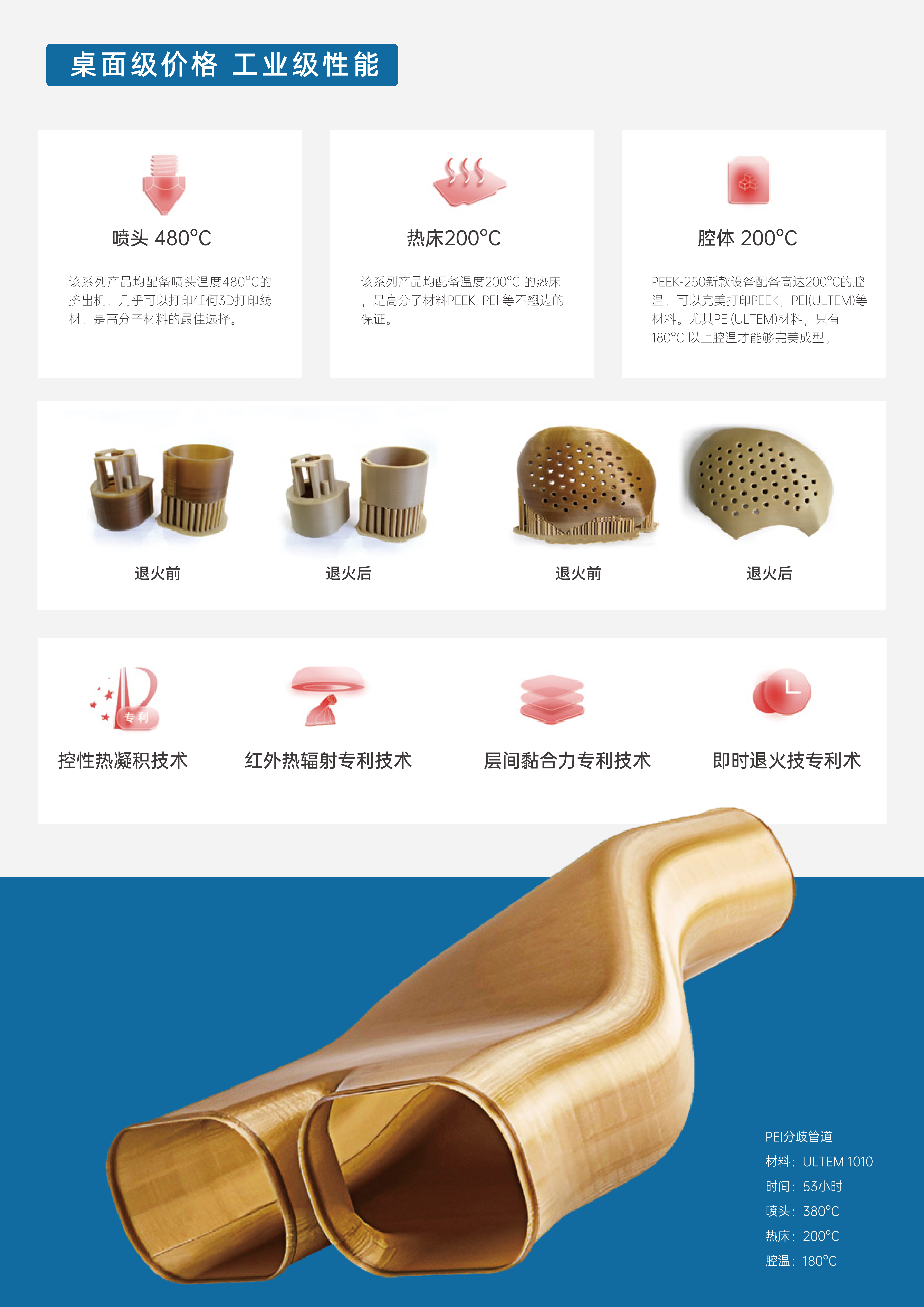 超高溫處理能力:噴頭溫度可達480°C,熱床溫度高達200°C,工作艙溫度可達200°C,這使得PEEK-250能夠處理包括PEEK、PEKK、CF-PEEK、GF-PEEK在內的高性能耗材,以及PPSU、PEI (ULTEM)、PA12、PSU、PPS等高溫耗材。