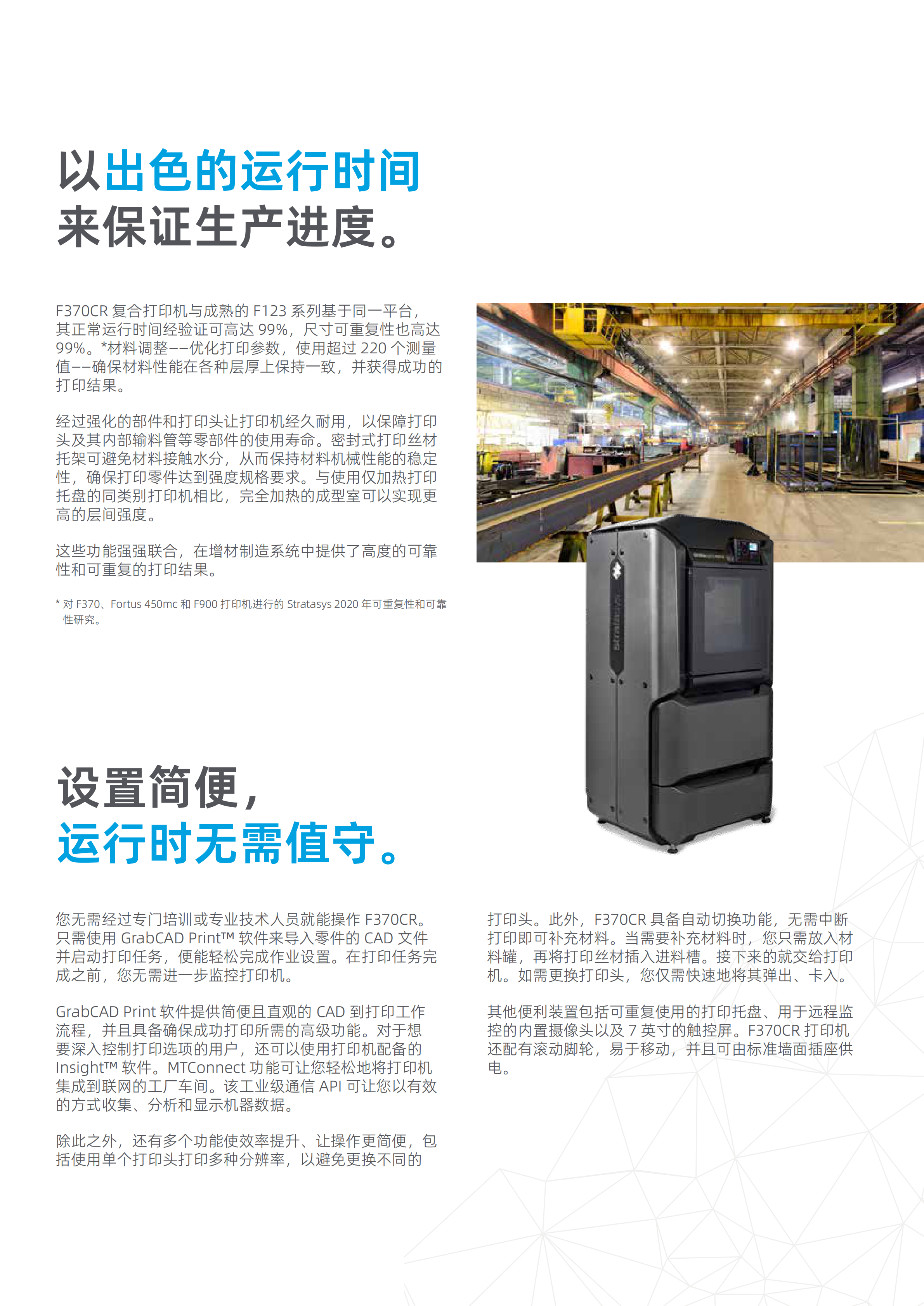 F370CR 復(fù)合打印機與成熟的 F123 系列基于同一平臺,其正常運行時間經(jīng)驗證可高達(dá) 99%,尺寸可重復(fù)性也高達(dá) 99%。通過材料調(diào)整和優(yōu)化打印參數(shù),使用超過 220 個測量值,保持材料性能在各種層厚上一致,并獲得成功的打印結(jié)果。經(jīng)過強化的部件和打印頭使打印機經(jīng)久耐用,保障打印頭及其內(nèi)部輸料管等零部件的使用壽命。完全加熱的成型室可以實現(xiàn)更高的層間強度。