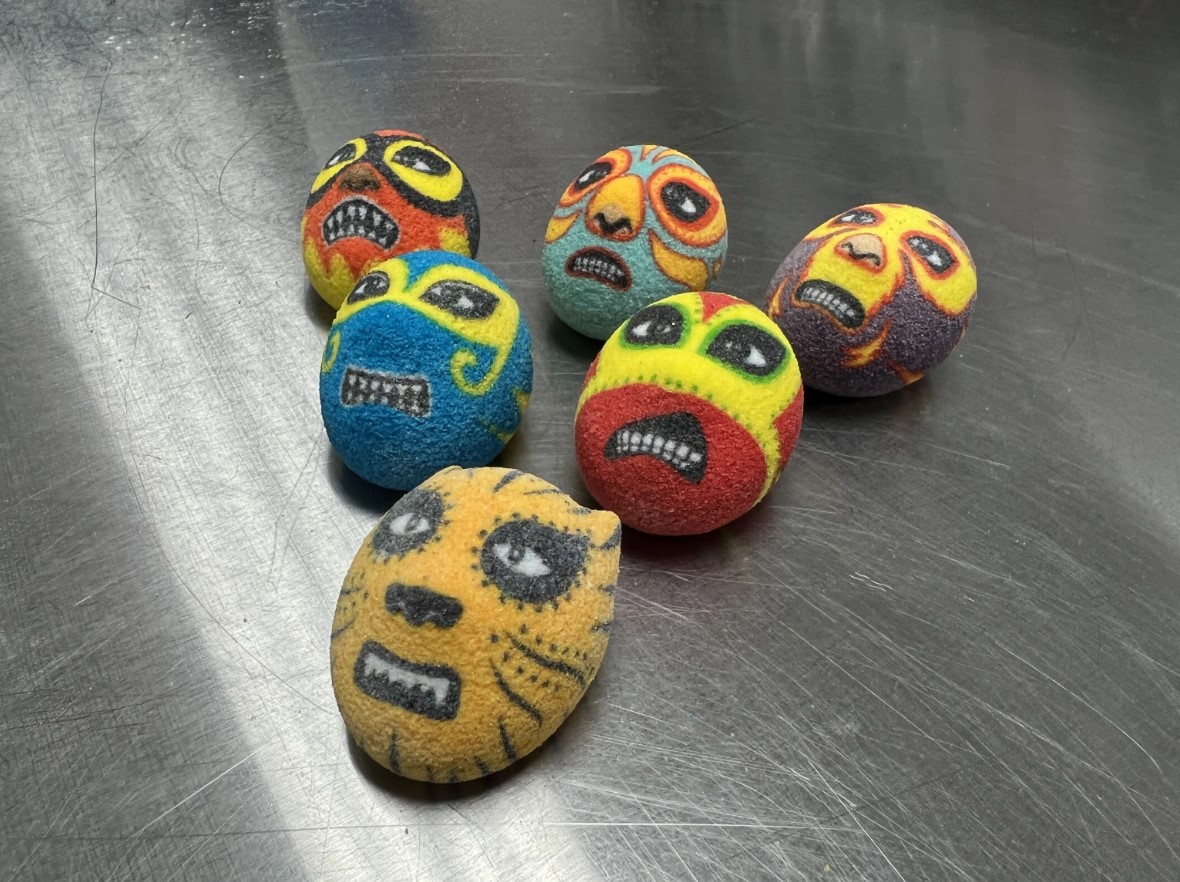 食品3D打印機一次可以打印出多個糖果。最后的成品被運輸出機器,然后用壓縮空氣吹掃,以去除多余的糖粉。這是相當戲劇性的一幕,因為糖果的真正鮮艷的設計和顏色一瞬間被展現出來。